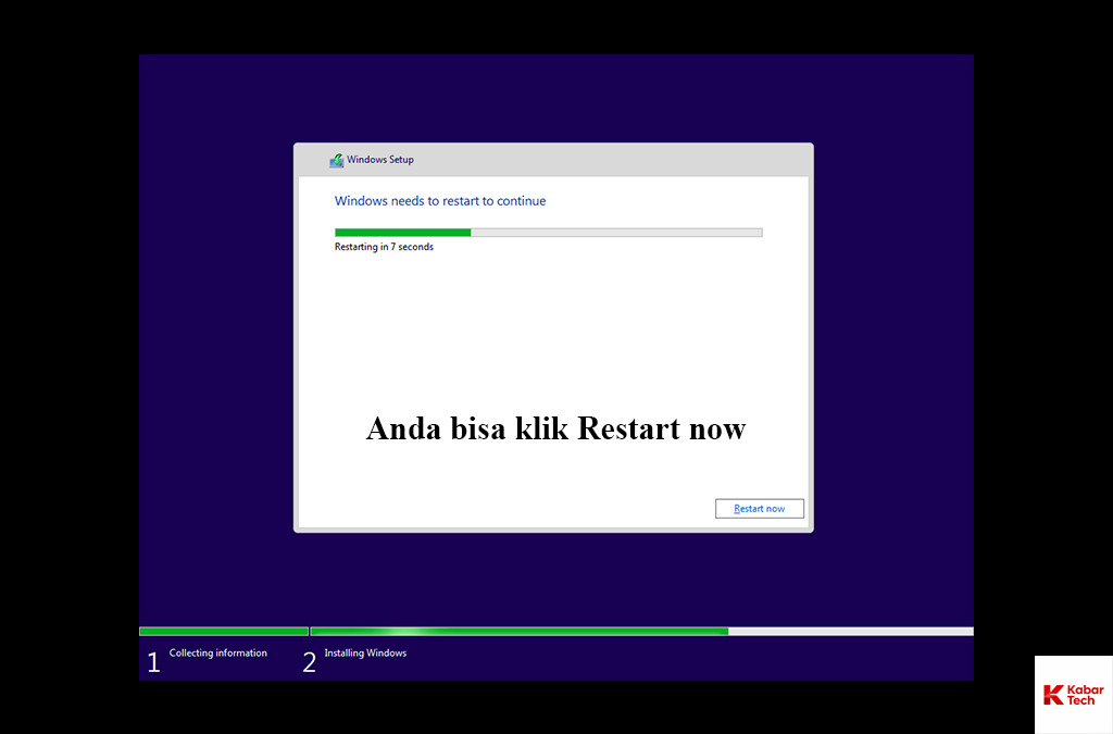 Apabila sudah muncul tampilan countdown (hitungan mundur) untuk restart seperti dibawah ini, silahkan anda klik Restart now lalu cabut USB dan tunggu sampai masuk ke setup awal tampilan windowsnya.